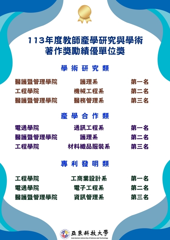 年度教師產學研究與學術著作「績優單位」與「個人獎」之獲獎單位與教師