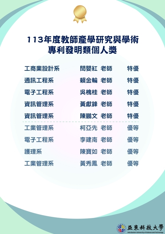 【賀】本系113年度教師產學研究與學術著作獎勵獲獎